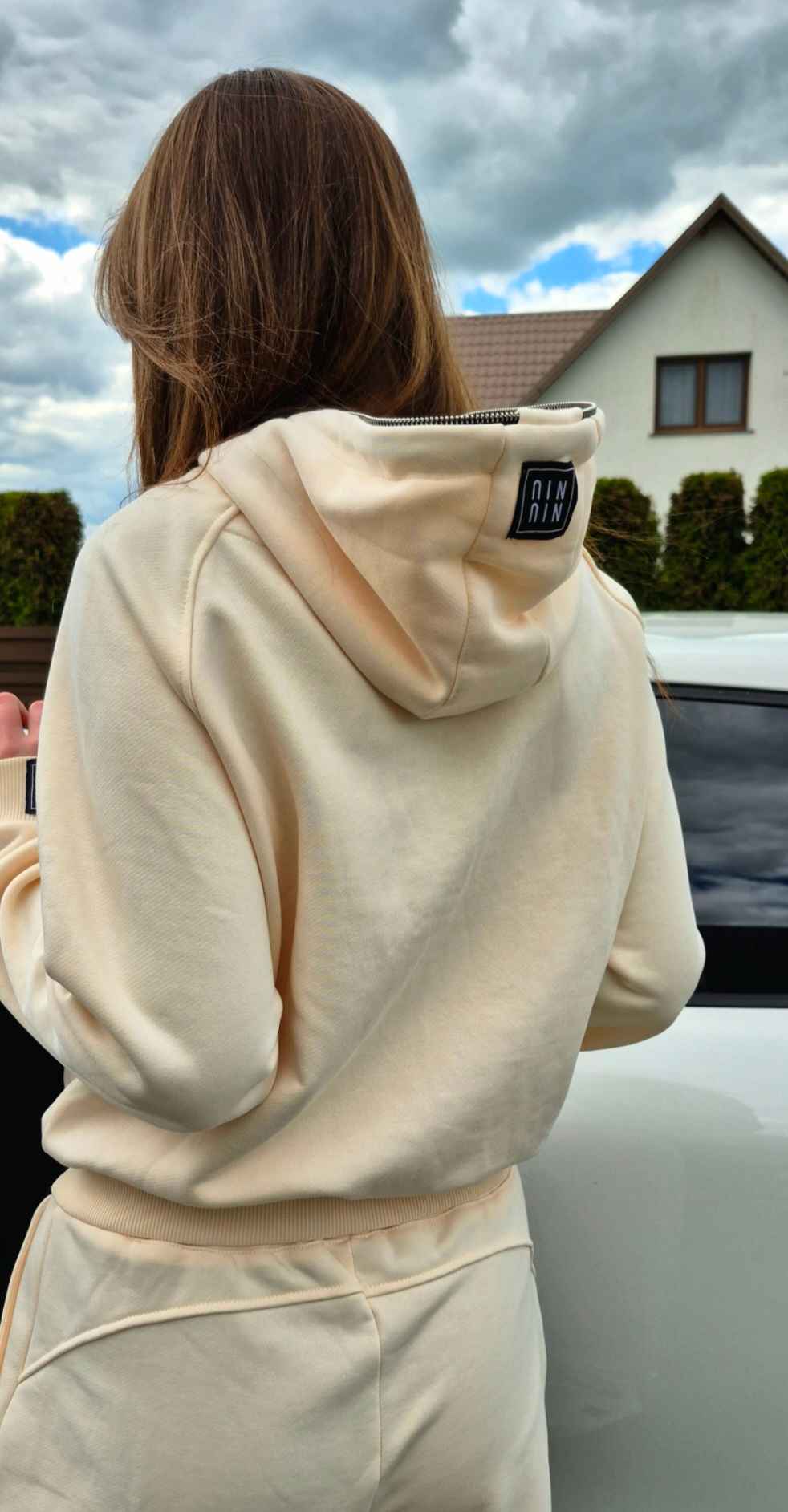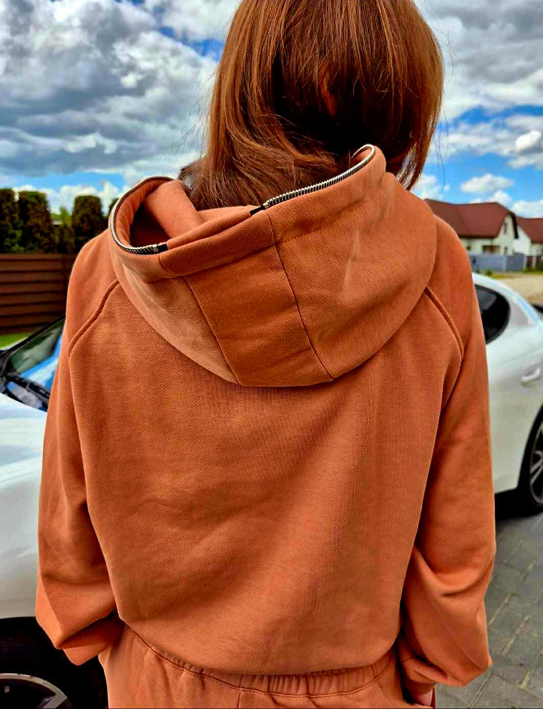 Džemperio lekalas su masyviu kapišonu ir išskirtine detale (Per visą kapišono ilgį einančiu užtrauktuku).